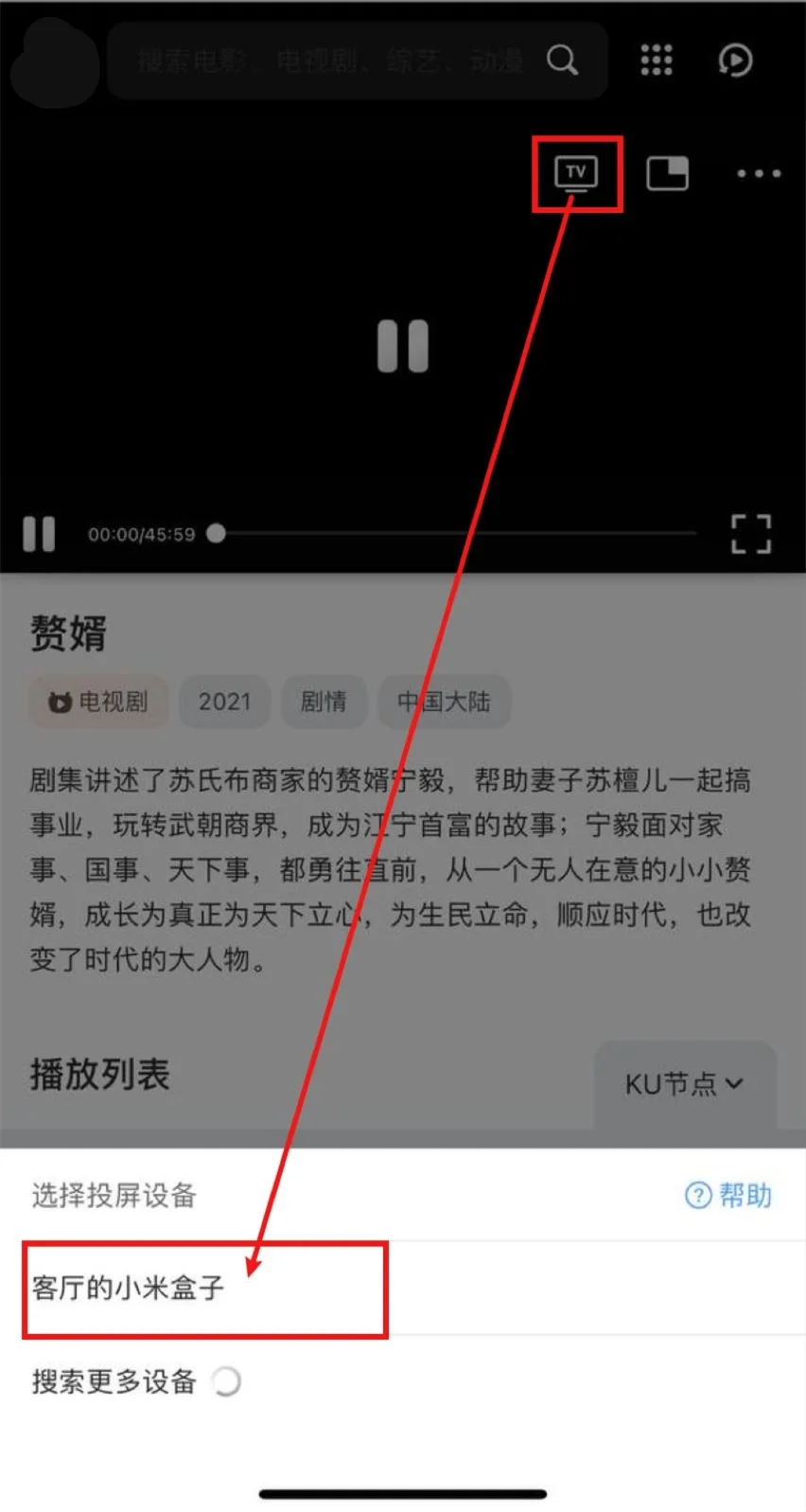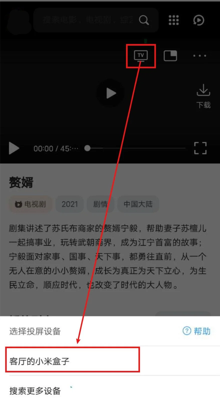 打开QQ浏览器(会接管网页播放器)->打开免费影视基地->播放视频->选中投屏图标->等待搜寻出智能电视/电视盒子->选中,即可投屏。